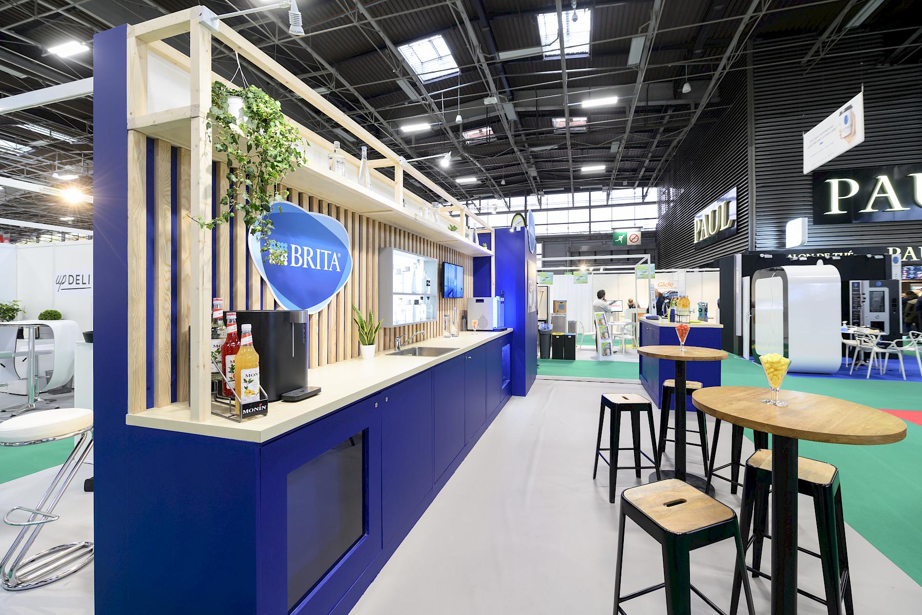 Ce bar a la particularité de respecter la largeur minimale des formats conventionnels de stands, pour ne pas avoir à être modifié, permettant à notre client de réserver une surface allant de 15m2 jusqu'à 100m2.