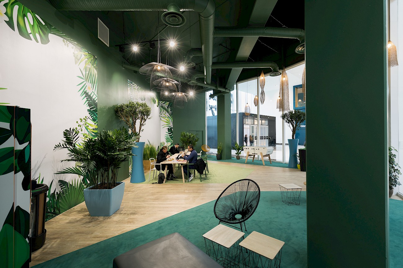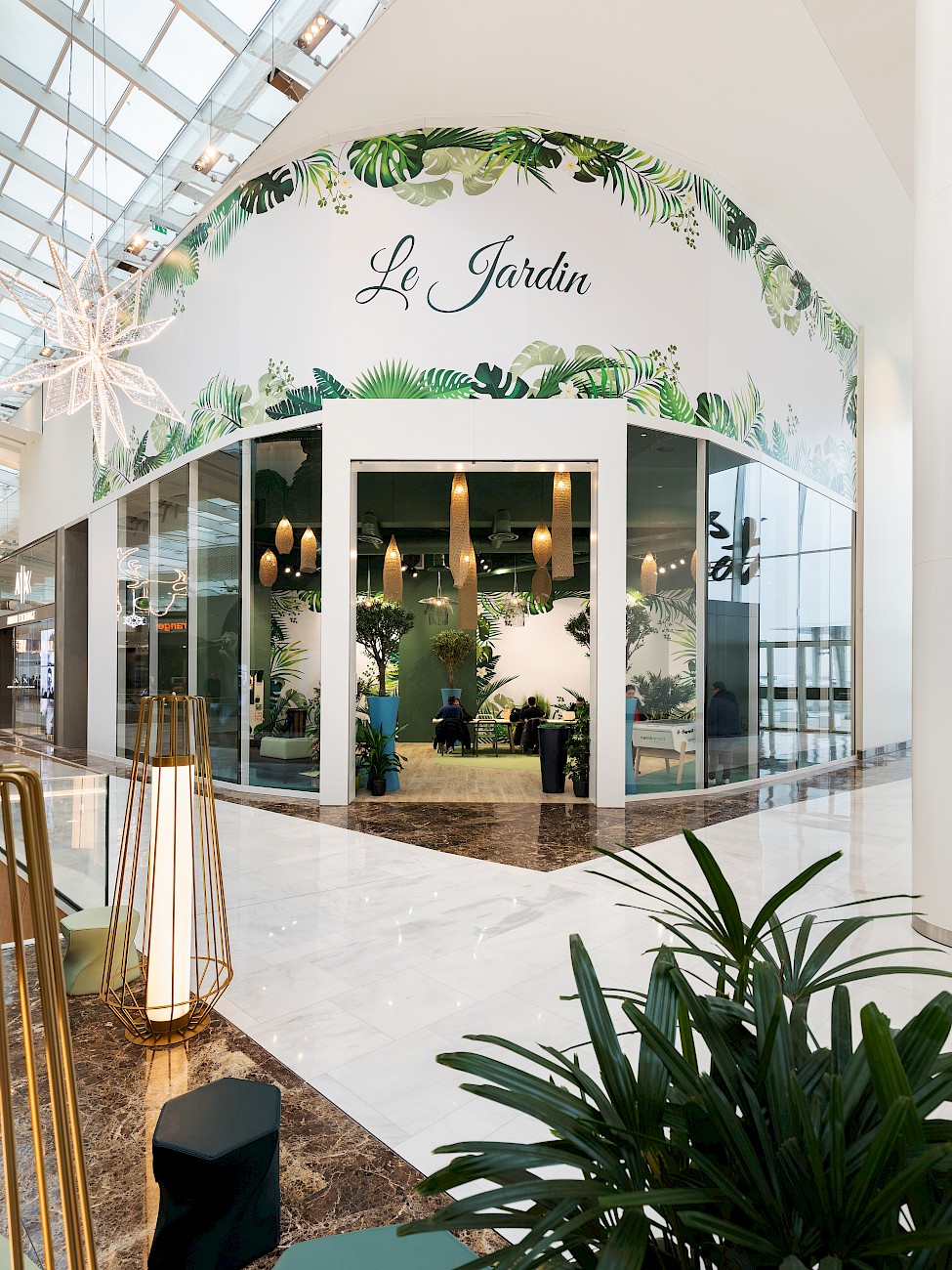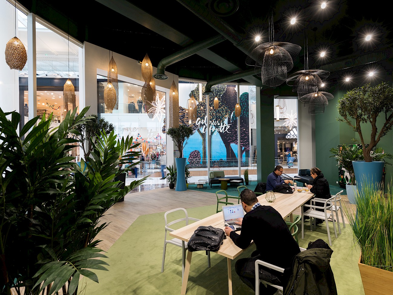 Nous avons conçu le Jardin d'Hiver et le Jardin d'Eté. Le jardin d'Hiver est un Lounge destiné aux visiteurs et clients du centre commercial. Il permet de patienter tout en s'amusant ou en travaillant. C'est une réponse simple mais essentielle à l'exploitation d'un espace qui n'a pas encore trouvé preneur.