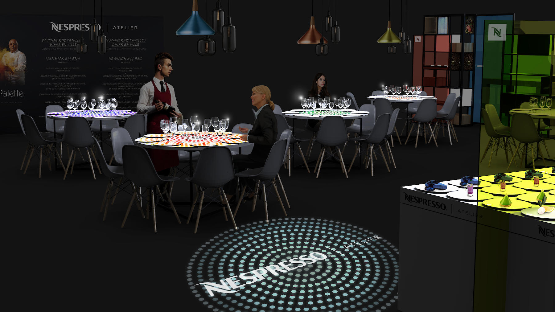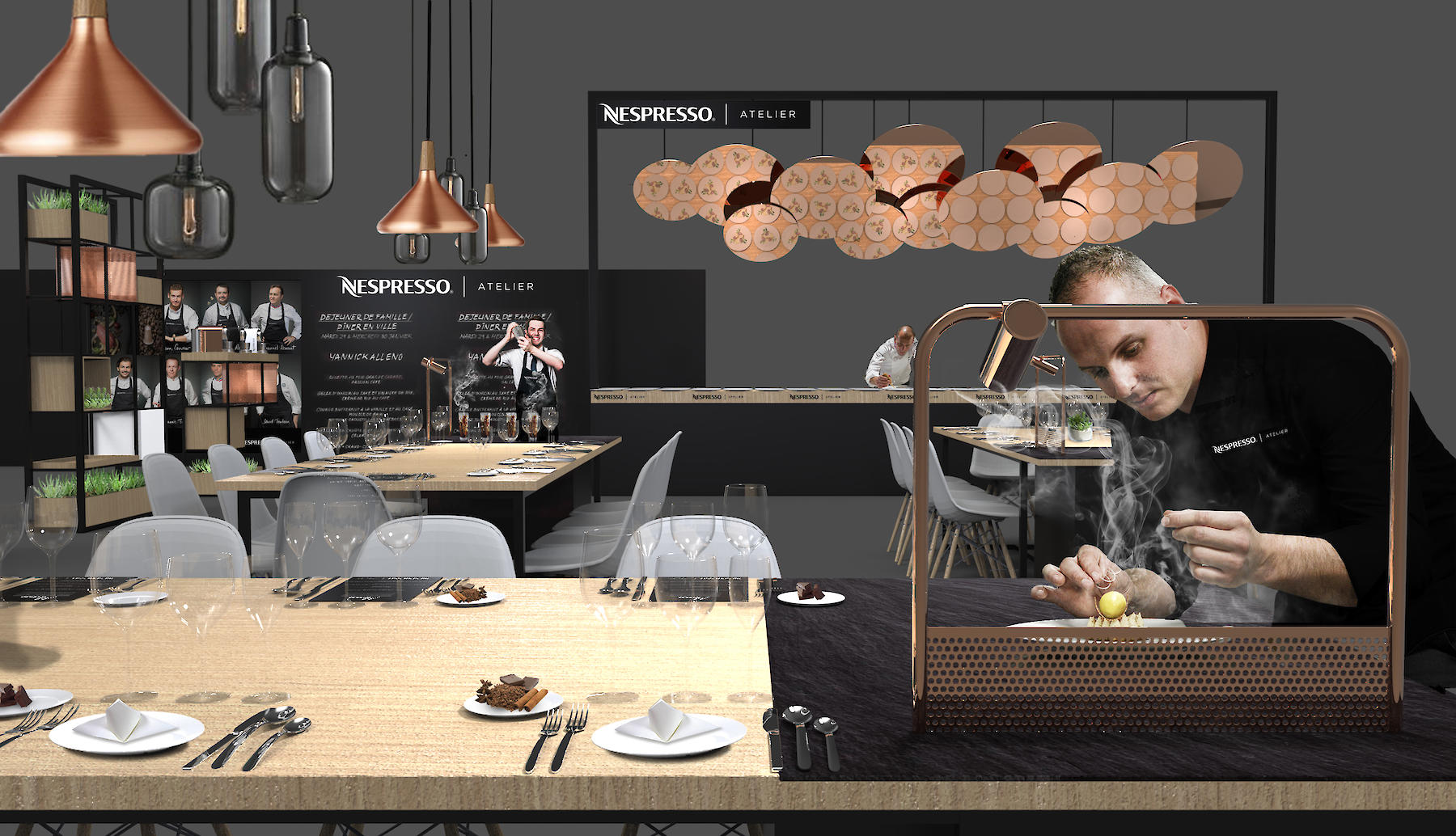 Dans ce restaurant la teinte fond Nespresso a été associée à la brillance et l'énergie du cuivre. L'ensemble est animé par des touches de couleurs qui se réfèrent "évidemment" aux capsules de cafés, créant ainsi une élégante harmonisation.