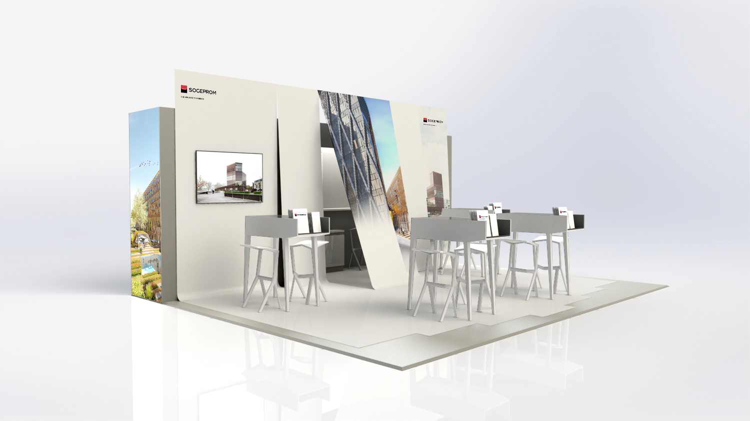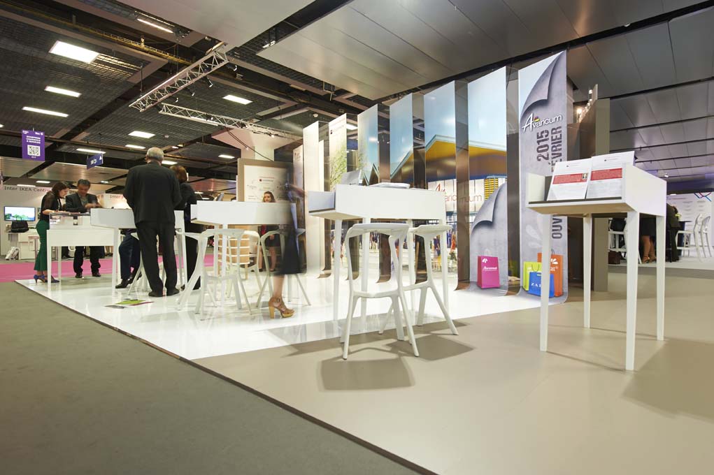 Issu du concept dont vous trouverez l'origine dans un autre article du présent site internet, ce stand mise sur l'ouverture pour une totale accessibilité et une parfaite visibilité. Le mobilier peut s'adapter aux différentes séquence de vie sur le stand (accueil commercial, évènement, démonstration). En parallèle, le rythme des bandes rappelle l'audace architecturale (et montante) des projets alors défendus par le promoteur. Elle permettent aussi de structurer l'espace et de camoufler un salon VIP. La mise en scène de ces bandes a été, durant longtemps, une activité ludique et c'est aussi ce qu'on aime dans nos projets : impliquer nos clients vers un soupçon de "fantaisie".