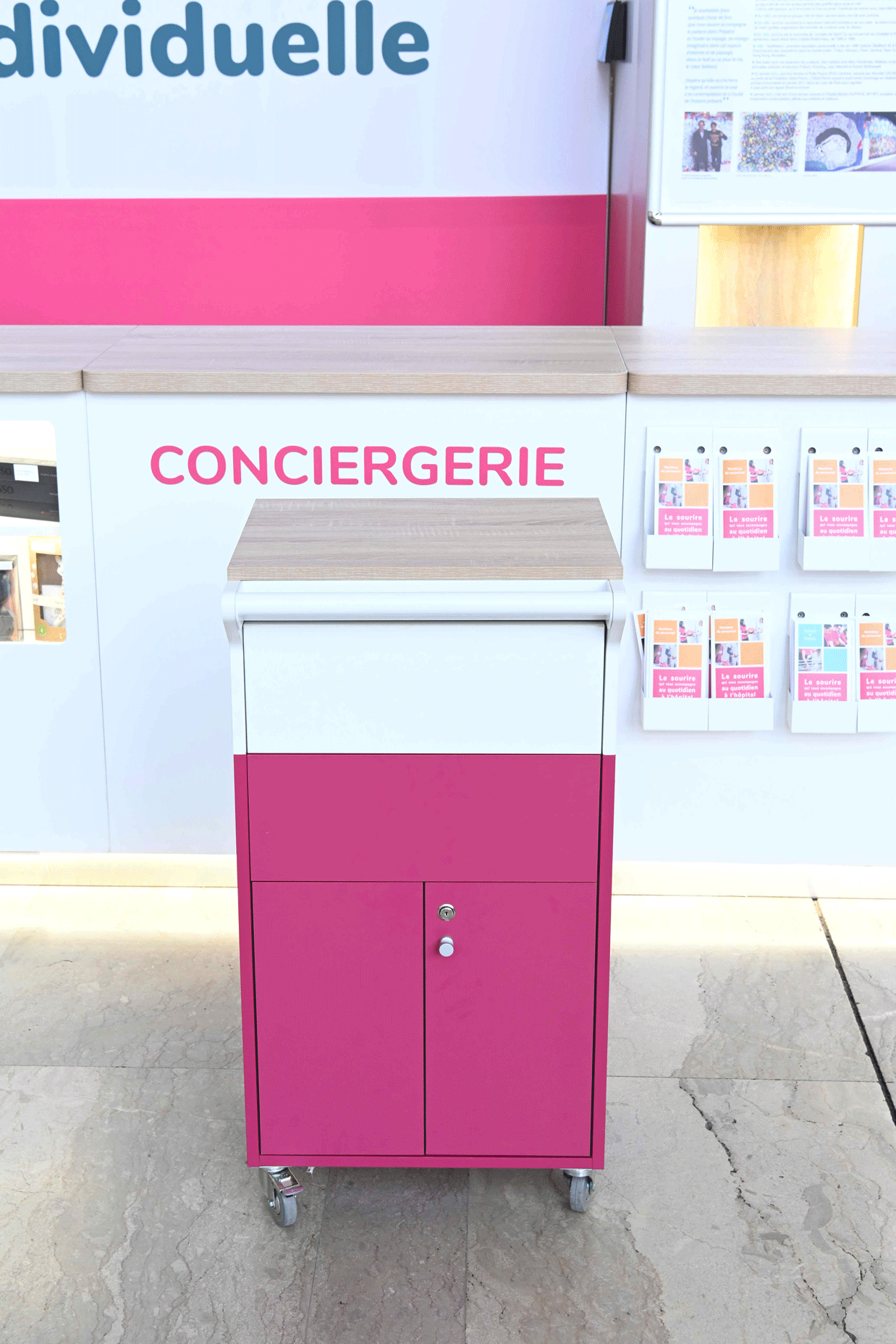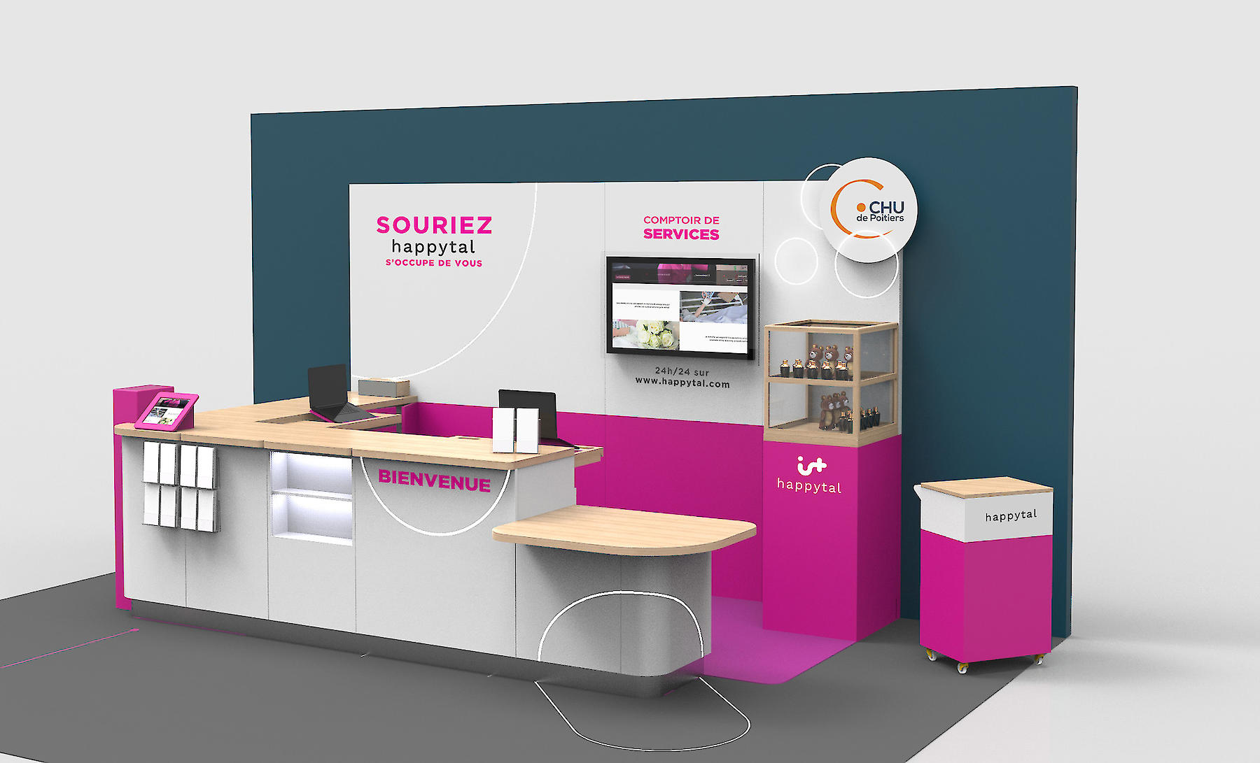 Installer des comptoirs de conciergerie dans les hôpitaux pour adoucir le séjour des patients, est la mission que la startup Happytal s’est confiée. Un accompagnement qui nécessitait un espace d’accueil design et sur mesure.