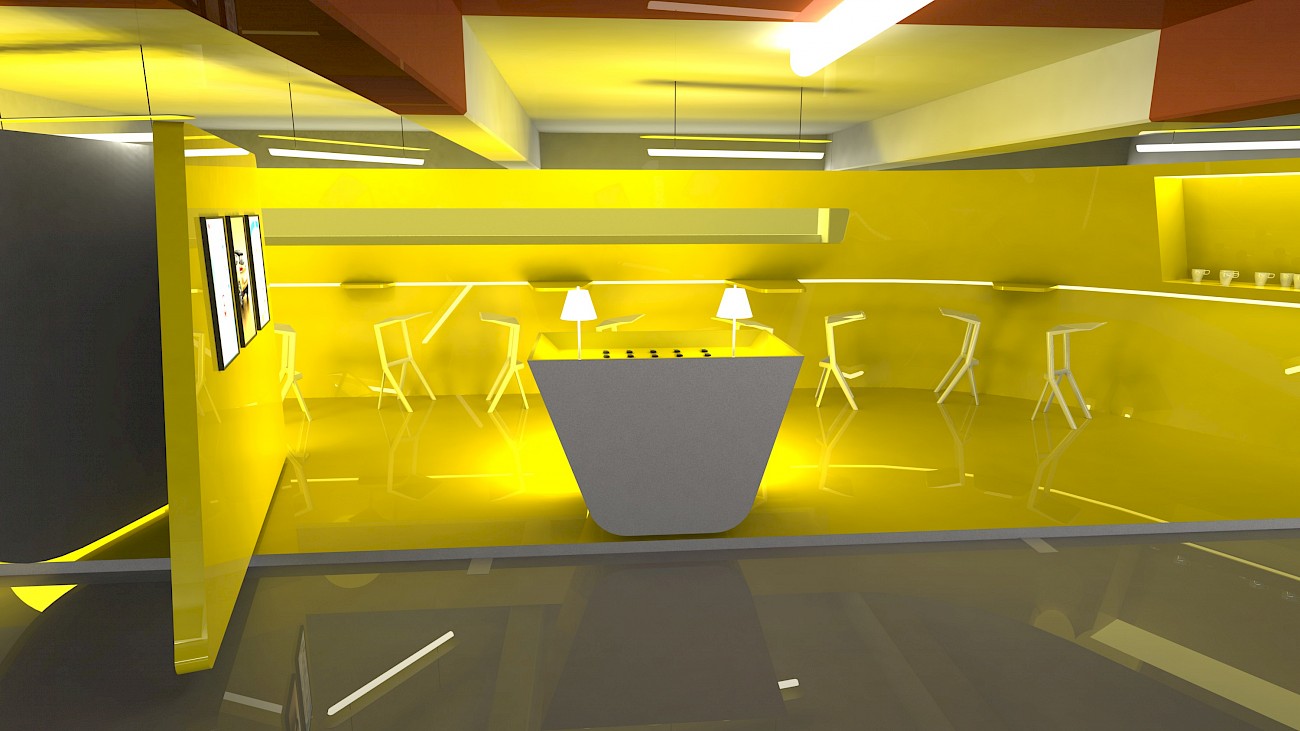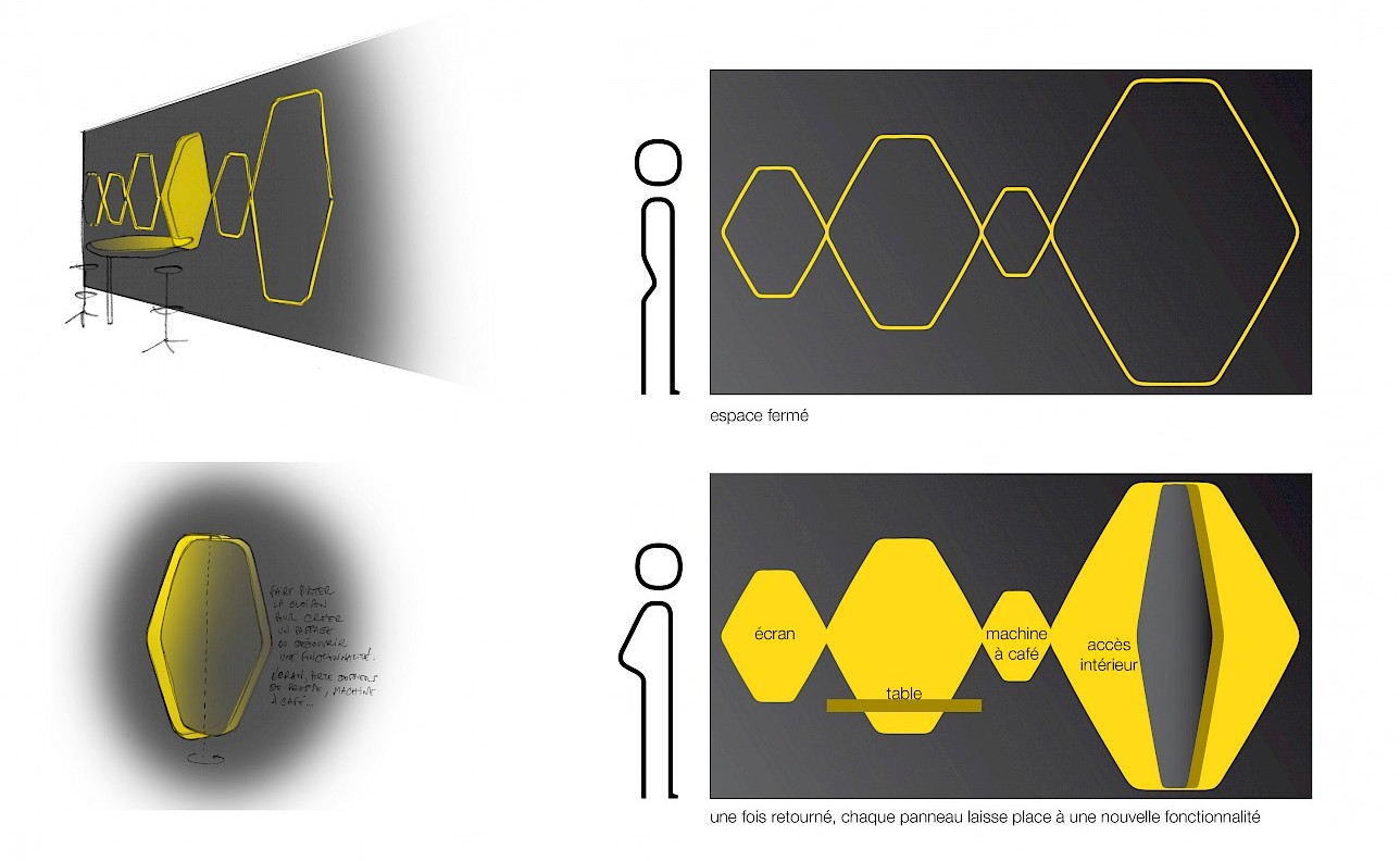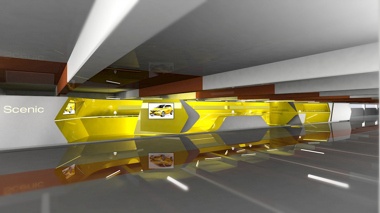 Commande d'Hopscotch : cette fois-ci c'est un parking qui accueille notre scéno pour une scénic. Jouant sur les contrastes, nous offrons de l'inattendu dans ces lieux lugubres et gras. Nous dévoilons progressivement le programme du client dans un écrin doré. Un jeu de cloisons pivotantes et de volets croisés mettent en lumière un espace scénique éblouissant !