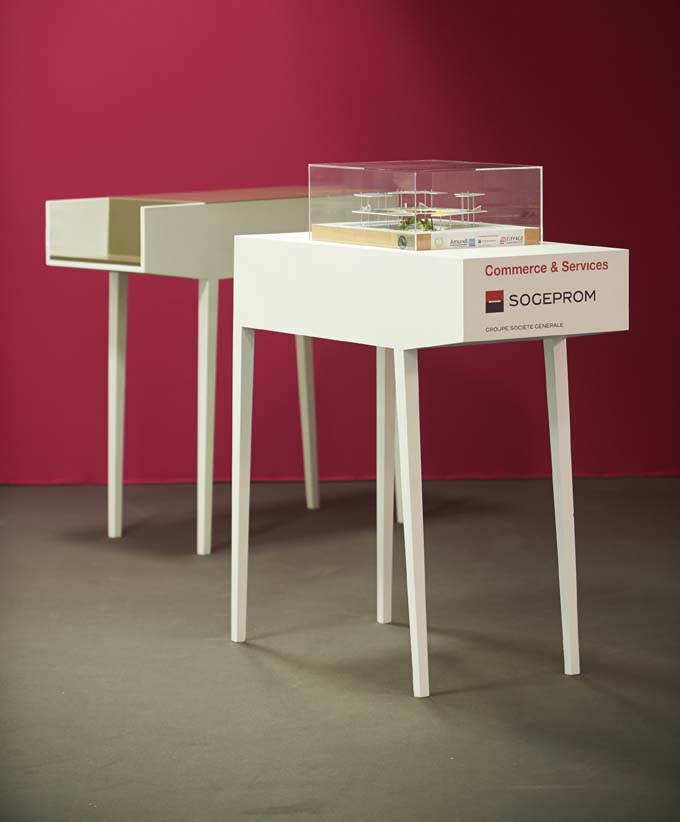 Issu du concept dont vous trouverez l'origine dans un autre article du présent site internet, ce stand mise sur l'ouverture pour une totale accessibilité et une parfaite visibilité. Le mobilier peut s'adapter aux différentes séquence de vie sur le stand (accueil commercial, évènement, démonstration). En parallèle, le rythme des bandes rappelle l'audace architecturale (et montante) des projets alors défendus par le promoteur. Elle permettent aussi de structurer l'espace et de camoufler un salon VIP. La mise en scène de ces bandes a été, durant longtemps, une activité ludique et c'est aussi ce qu'on aime dans nos projets : impliquer nos clients vers un soupçon de "fantaisie".