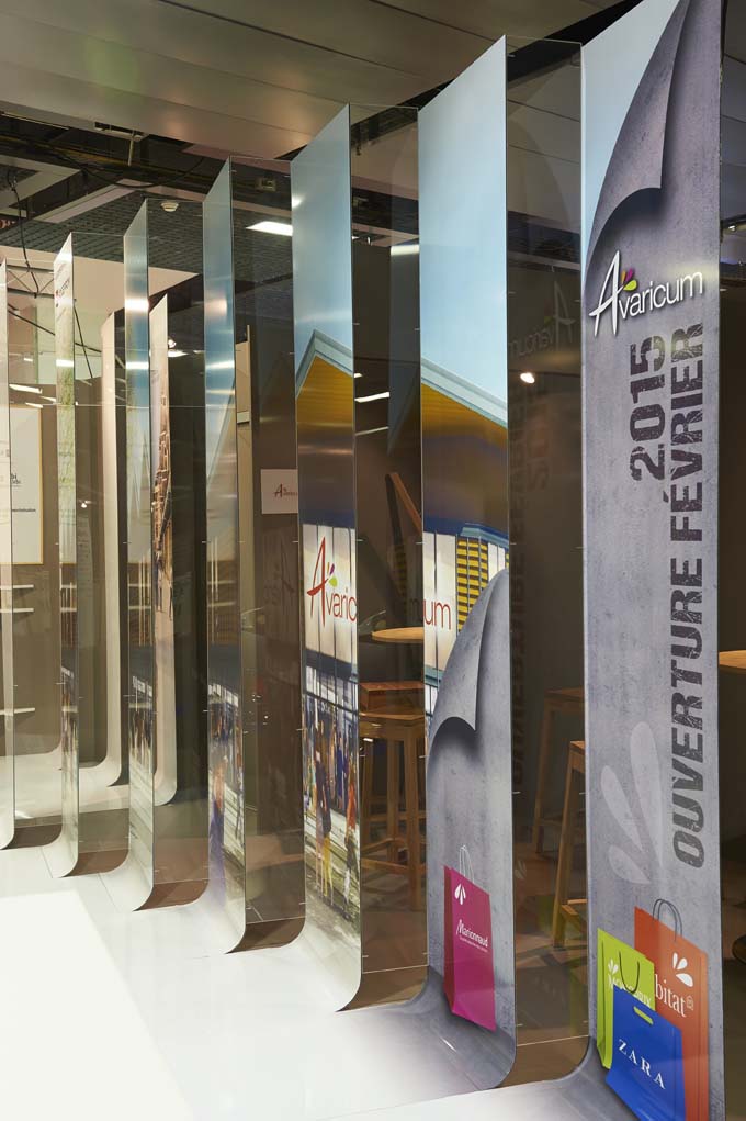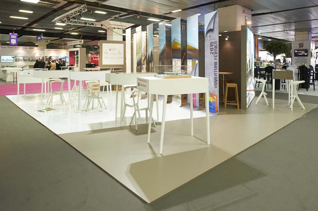 Issu du concept dont vous trouverez l'origine dans un autre article du présent site internet, ce stand mise sur l'ouverture pour une totale accessibilité et une parfaite visibilité. Le mobilier peut s'adapter aux différentes séquence de vie sur le stand (accueil commercial, évènement, démonstration). En parallèle, le rythme des bandes rappelle l'audace architecturale (et montante) des projets alors défendus par le promoteur. Elle permettent aussi de structurer l'espace et de camoufler un salon VIP. La mise en scène de ces bandes a été, durant longtemps, une activité ludique et c'est aussi ce qu'on aime dans nos projets : impliquer nos clients vers un soupçon de "fantaisie".